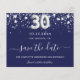 Observera att det här Spara datumet är pappert och mycket tunt. Kuvert ingår inte. Om du vill ha ett tjockare Spara datumkortet (samma design) kan du besöka vår butik. Ett giftigt och trendig Spara datumkortet för ett 30års födelsedag party. En marin blå färgad bakgrund. Dekorerad med faux silver-stjärnor. Texten: Spara datumet skrivs med ett stort trendig-handskript i stil. Nummer 30 skrivs med ett stil-teckensnitt med ballong.