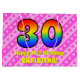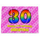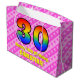 Den här presentsäcksdesignen i lycklig och 30års födelsedag i festen har ett stort nummer "30" som inspirerats av att ett regnbågsspektrum ser ut. Det innehåller också meddelandet "Lycklig 30års födelsedag,", följt av ett eget namn. Bakgrunden är en glad mönster av ljust rosa och mörk rosa rand som innehåller levande hjärtan i rosa. En presentpåse som denna kan användas när man slår in presenter eller ger gåvor för att fira någons trettioårsdag. [~Z0000414]