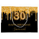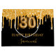 Chicens svarta bakgrund. Dekorerad med faux guld glitter droppar, färgdroppstift. Anpassa och lägg till ett namn. Med texten: Grattis på födelsedagen. Namn är skrivet med ett stil-skript med lägesbokstäver. Nummer 30 skrivs med ett stil-teckensnitt med ballong.
