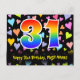 Framsidan av denna färgglada, kärleksfulla och roliga födelsedagskortdesign har ett stort nummer "31" med ett regnbågsspektrum-gradering-mönster. Den har också meddelandet "Grattis på 31-årsdagen," och ett anpassat mottagarnamn. Framsidan har dessutom ett färgglatt och livfullt mönster av kärleksfulla hjärtformer. Baksidan har ett personligt födelsedags-hälsningsmeddelande, eller kan kanske rensas och lämnas tomt om ett meddelande ska skrivas för hand istället. Ett födelsedagskort som detta kan vara ett roligt sätt att skicka födelsedagsönskningar till någon som firar sin trettioförsta födelsedag. Postkort som detta kan också användas för att inbjuda gäster till en födelsedagsfest
