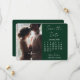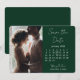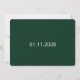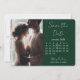 Med ett skoggrönt och vitt färgtema visar denna kalender 'spara datum' en modern, minimalistisk tema. Baksidan av kortet är skoggrön med vit text för påminnelsen om bröllopsdatum.