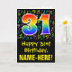 Framsidan av denna roligt, livfull och färgstark födelsedagsmatad hälsningskortdesign har ett stort nummer "31" med en regnbågsspektrumövertoning som inspirerat mönster. Det innehåller också meddelandet "Lycklig 31a Birthday" och en redigerbar mottagare namn. På framsidan finns också ett mönster med olika musik noter och symboler som har en rad olika färger och storlekar. Insidan innehåller ett hälsning-meddelande på anpassningsbarnas födelsedag, eller så kan det kanske rensas och lämnas tomt om ett meddelande ska skrivas för hand i stället. Ett sådant här födelsedagskort i anpassningsbar kan vara ett roligt sätt att skicka önskemål till en musiker, sångare, kompositör eller någon annan som firar sin trettioförsta födelsedag. [~Z0000420]
