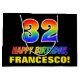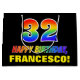 Den här sminka, färgstarka och roligtens födelsedagsmatade presentsäck har ett stort nummer "32" och meddelandet "GRATTIS PÅ FÖDELSEDAGEN", som båda har en regnbågsspektrumövertoning som inspirerar mönster-färgning, tillsammans med en fet gult redigerbar mottagare namn. Bakgrunden är svart på färgad. En sådan här presentpåse på roligtens födelsedag kan användas för att figurera en gåva eller present som ges för att fira någons trettioandra födelsedag. [~Z0000477]