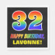 Den här roligten, som är färgstark och rolig, papper napkindesign med födelsedagstext, har ett stort nummer "32" och meddelandet "GRATTIS PÅ FÖDELSEDAGEN,", båda färgader med en regnbågsspektrumövertoning som inspirerade mönster, tillsammans med en modig mottagare av anpassade med gult namn. Bakgrunden är svart på färgad. Roligt, personlig födelsedag sådana pappra blöjor kan användas vid någons 32-årsfirande. [~Z0000476]