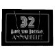 Det här 1920-talet-1930-talet ser inspirerad ut som en presentsäck med födelsedag i vintagen och har en stor konsthugga som ser inspirerad ut till nummer "32", Lycklig 32:a födelsedagen", ett eget namn och gräns mönster som består av tunt linjer. Bakgrunden är svart på färgad. En dylik presentpåse på födelsedagen kan användas när en gåva eller present i firande på någons trettioandra födelsedag är ge. [~Z0000497]