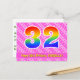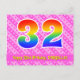 Framsidan av denna glada, kärleksfulla och roliga födelsedagskortdesign har ett stort nummer "32" med ett regnbågsspektrum-gradering-mönster. Den har också texten "Grattis på 32-årsdagen," och ett personligt mottagarnamn. Framsidan har dessutom ett glatt mörkt rosa och ljust rosa-randigt mönster med hjärtformer. Baksidan har ett redigerbart födelsedagsgratulationsmeddelande, eller kan kanske rensas och lämnas tomt om ett meddelande ska skrivas för hand istället. Ett personligt födelsedagskort som detta kan vara ett roligt sätt att skicka ett meddelande för att fira någon:s trettioandra födelsedag. Postkort som detta kan också användas för att inbjuda gäster till en födelsedagsfest som hålls för någon