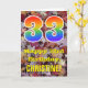 Framsidan av denna färgstarka, naturinspirerade och strålande födelsedagskalenderdesign har ett stort nummer "33" med en regnbågsspektrumövertoning som inspirerade mönster. Det innehåller också meddelandet "Lycklig 33:e födelsedagen" och ett eget namn. Bakgrunden till kortets framsida har en kraftig nedgång i höst löv mönster. Insidan innehåller ett anpassat hälsning-födelsedagsmeddelande eller kan kanske tas bort och lämnas tomt om ett meddelande ska skrivas för hand i stället. Ett sådant här födelsedagskort i personlig kan vara ett roligt för att skicka ett meddelande i firande om någons trettiotredje födelsedag. [~Z0000384]