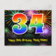 Framsidan av denna spännande, roliga och färgglada födelsedagskortdesign har en stor siffra "34" med ett regnbågsspektrum-gradering-mönster. Den har också texten "Grattis på 34-årsdagen," och ett redigerbart mottagarnamn. Framsidan har dessutom ett färgrikt och livfullt bakgrundsmönster inspirerat av utseendet på fyrverkerier som exploderar i en festlig stämning. Baksidan har ett redigerbart födelsedagsmeddelande, eller kan rensas och lämnas tomt om ett meddelande ska skrivas för hand istället. Ett anpassningsbart födelsedagskort som detta kan vara ett roligt sätt att fira någon på deras trettiofjärde födelsedag. Kort som detta kan också användas för att inbjuda gäster till