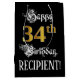 Den här presentsäcksdesignen i finare och den opulenta födelsedagspressen innehåller meddelandet "Lycklig 34:e födelsedagen" och en anpassningsbar mottagare namn. En del av meddelandet finns i en lyxig text med skript-stil. Det stora antalet "34:e" har ett faux/imitation guld-inspirerat utseende mönster. Bakgrunden är svart på färgad. En sådan här portalpåse kan vara ett respektabelt sätt att fylla en födelsedagspresent eller gåva som ges till någon som firar sin trettiofjärde födelsedag. [~Z0000560]