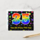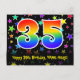 Framsidan av denna färgglada, roliga och spännande födelsedagskortdesign har en stor siffra "35" med ett regnbågsspektrum-gradering-mönster, tillsammans med meddelandet "Grattis på 35-årsdagen," och ett redigerbart mottagarnamn. Framsidan har dessutom en färgrik och livfull bakgrund med ett mönster av stjärnformer. Baksidan har ett anpassat födelsedagsmeddelande, eller kanske kan tömmas och lämnas tomt om ett meddelande ska skrivas för hand istället. Ett personligt födelsedagskort som detta kan vara ett roligt sätt att fira någon på deras trettiofemårsdag. Postkort som detta kan också användas för att bjuda in gäster till en födelsedagsfest eller ett party som hålls för någon som fyller 35 år