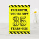 På framsidan av den här roligten och med den uppmärksammade födelseteckendesignen finns ett anpassade namn och meddelandet "DU ÄR NU 35 ÅRS GAMLA!" i svart stencil inspirerade till färgad på gulten. Det finns också en gult som fångar öga och ett svart, strippat mönster överst och grund kant längst fram. Insidan innehåller ett anpassat hälsning-födelsedagsmeddelande eller kan kanske tas bort och lämnas tomt om ett meddelande ska skrivas för hand i stället. Ett sådant här födelsedagskort i anpassadet kan vara ett roligt för att erkänna någons trettiofemte födelsedag. [~Z0000413]