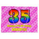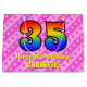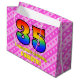Den här lycklig- och roligt-35ens födelsedag innehåller en stor siffra "35" med mönster inspirerad av ett regnbågsspektrum. Det innehåller också budskapet "Lycklig 35e Birthday", följt av en personlig namn. Bakgrunden har en ljus rosa och mörk rosa rand mönster som innehåller levande hjärtformer av rosa. En presentpåse som denna kan användas när man slår in gåvor eller presenter för att fira någons trettiofemårsdag. [~Z0000414]