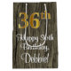 Den här snyggten har en lyxig och sofistikerad presentsäcksdesign med ett stort ordnummer "36:e" som har ett utseende som inspirerats av faux/imitation guld, utöver hälsning-födelsedagsmeddelandet "Lycklig 36:e födelsedagen" och en anpassningsbar mottagare namn i ett skript-stil-teckensnitt. Den har också en faux wood-inspirerad bakgrund mönster. En sådan här presentpåse på elegantens födelsedag kan vara ett roligt sätt att figurera en gåva eller gåva som ges till någon som firar sin trettiosjätte födelsedag. [~Z0000520]