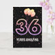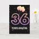 Party-ballonger och konfetti mot svart bakgrund med nyon nummer 36 för en 36-årsdag.