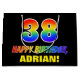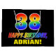 Den roliga, färgstarka och roligt-födelsedagskalans presentväska har ett stort nummer "38" och meddelandet "GRATTIS PÅ FÖDELSEDAGEN", som båda har en regnbågsspektrumövertoning som inspirerar mönster-färgning, tillsammans med en fet gult anpassningsbar mottagare namn. Bakgrunden är svart på färgad. En sådan här presentpåse på roligtens födelsedag kan användas för att figurera en gåva eller present som ges till någon som firar sin trettioåttonde födelsedag. [~Z0000477]