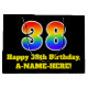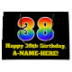 Denna pulserande och färgstarka födelsedagskalemeterade presentsäcksdesign har ett stort nummer "38" med en regnbågsspektrumövertoning som inspirerade mönster. Det innehåller också budskapet "Lycklig 38:e födelsedag" och ett anpassade namn. Den har också en bakgrund med svart färgad. En presentpåse som denna kan vara ett roligt sätt att fylla på en födelsedagspresent eller gåva som ges till någon som firar sin 38-årsdag. [~Z0000521]