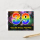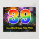 Framsidan av denna spännande, roliga och färgglada födelsedagstema postkortsdesign har en stor siffra "39" med ett regnbågsspektrum-gradering inspirerat mönster, tillsammans med meddelandet "Grattis på 39-årsdagen," och ett anpassningsbart mottagarnamn. Framsidan har dessutom ett färgglatt och livfullt bakgrundsmönster inspirerat av utseendet på sprängande firande fyrverkerier. Baksidan har ett redigerbart födelsedagsmeddelande, eller kan kanske rensas och lämnas tomt om ett meddelande ska skrivas för hand istället. Ett personligt födelsedagskort som detta kan vara ett roligt sätt att fira någon på deras trettionionde födelsedag. Postkort som detta kan också användas för att inbjuda gäster till en