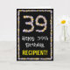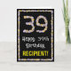 På framsidan av den här roligten, med naturinspirerad födelsedag, finns hälsningskortet "Lycklig 39:e födelsedagen" och ett anpassade som får namn. Det stora talet "39" och gräns på framsidan har båda blomsikonerna. Insidan innehåller ett redigerbart hälsning-födelsedagsmeddelande, eller så kan det kanske rensas och lämnas tomt om ett meddelande ska skrivas för hand i stället. Ett blommigt, anpassat födelsedag som detta kan vara ett roligt sätt att ge ett hälsning-födelsedagsmeddelande till någon som firar sin trettionionde födelsedag. [~Z0000648]