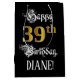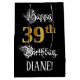 This opulent and fancy birthday giftbag design features the message “Happy 39th Birthday,”, and a custom recipient name. Part of the message is in an ornate script-style text, the large number “39th” features a faux/imitation gold-inspired look pattern, and the background is colored black. An elaborate giftbag like this might be a respectable way of wrapping a birthday present or gift being given to somebody who is celebrating their thirty ninth birthday. [~Z0000560]