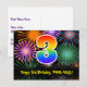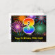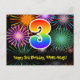 Framsidan av denna färgglada, spännande och roliga födelsedagskortdesign har en stor siffra "3" med ett regnbågsspektrum-gradering-mönster. Den har också meddelandet "Grattis på 3-årsdagen," och ett redigerbart mottagarnamn. Framsidan har dessutom ett färgglatt och livfullt bakgrundsmönster inspirerat av sprängande firande fyrverkerier. Baksidan har ett anpassat födelsedags-hälsningsmeddelande, eller kanske kan tömmas och lämnas tomt om ett meddelande ska skrivas för hand istället. Ett anpassningsbart födelsedagskort som detta kan vara ett roligt sätt att erkänna någon på deras tredje födelsedag. Kort som detta kan också användas för att bjuda in gäster till en födelsedagsfest eller fir