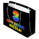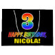 Denna glada, färgstarka och roligt födelsedag med presentsäck har ett stort nummer "3" och meddelandet "GRATTIS PÅ FÖDELSEDAGEN", båda färgader med en regnbågsspektrumövertoning som inspirerade mönster, tillsammans med en fet gult personlig mottagare namn. Bakgrunden är svart på färgad. En sådan här presentpåse på roligtens födelsedag kan användas när en gåva eller present i firande på någons tredje födelsedag är ge. [~Z0000477]