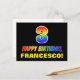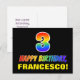 Framsidan av denna färgstarka, glada och roligt födelsedag med vykort har ett stort nummer "3" och meddelandet "GRATTIS PÅ FÖDELSEDAGEN", båda färgader med en regnbågsspektrumövertoning som inspirerade mönster, tillsammans med en fetstilt gult som kan redigeras i namn. På framsidan finns också en enkel bakgrund för svart färgad. Baksidan av vykortet har ett hälsning-meddelande från anpassadets födelsedag, eller kan kanske tas bort och lämnas tomt om ett meddelande ska skrivas för hand i stället. Ett spännande vykort för anpassadets födelsedag som detta kan vara ett roligt för att erkänna någons tredje födelsedag. [~Z0000474]