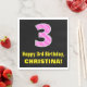 Den här glatta och roligt födelsedagskalan med papper napkin-design har ett stort nummer "3" som innehåller hjärtformer som innehåller mörk rosa och ljus rosa rand mönster. Det innehåller också hälsning:s födelsedagsmeddelande "Lycklig 3:e födelsedag" och ett redigerbart namn. Pappra servetter som denna kan vara roligt till använda vid ett party som hålls för att fira någons tredje födelsedag. [~Z0000436]