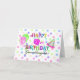 Ett roligt party-födelsedagskort för en 3-årig barndotter med konetti i bakgrunden i pastel färg, centrum med färgstark "Lycklig 3:e födelsedag" och "mordotter" i svart. På den lämnat sidan av ord hittar du en rosa polka-punktballong och en grönt-polka-punktballong, en party-hatt på höger.
