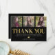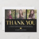 Tack vare det moderna studenten-kortet får du en snyggt svart bakgrund som kan ändras till vilken färg som helst, 3 foton från student, ord "tack" i ett formellt guld-teckensnitt, ett tackkort och graderna namn.