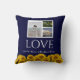 Chic Solros Elegant marinblå och vit Script Bröllopsfoto collage kudde, med en ram över en kolla av 3 av dina foton.