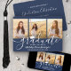 Dela glädjen av en gymnasie- eller högskoleexamen och bjud in familj och vänner att fira med dessa anpassade 3-foto-kollage i marinblå och vita inbjudningskort. Alla bilder och texter är enkla att anpassa. (TIP: Ett enkelt sätt att centrera ett foto exakt som du vill är att beskära det innan du laddar upp det till Zazzles webbplats.) Denna mall är formaterad för en examensfest, men kan enkelt anpassas som inbjudan till öppen hus eller ett annonskort. Ändra bara texten för att inkludera alla detaljer du vill ha, som föräldrarnas namn, speciella utmärkelser, examina, favoritcitat, examenens framtida planer eller ny adress. Om det finns någon text som inte önskas, raderas den helt enkelt. Designen har en mörkblå bakgrund, vit studentmössa, handskriven stilkalligrafi, modern minimalistisk typografi och tre foton som du väljer, till exempel seniorbilder eller bilder från examensceremonin. Detta eleganta examensinbjudningskort är ett trendigt och s