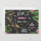 Chalkboard bjudande till 3-Rex-födelsedag för flickor med tropiska löv och blommor och guld dinosauer.