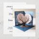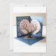 Denna bild visar ett öppet 3D-bröllopskort. Designen visar ett träd med förgrenade grenar som bär rosa hjärtformade blad, som symboliserar kärlek och romantik. Den blå bakgrunden har fina detaljer av vita gravyrer som ger kortet en konstnärlig och estetisk touch. Designen är innovativ och attraktiv och speglar känslor av kärlek och anknytning, vilket gör den mycket lämplig att använda vid bröllopstillfällen