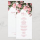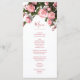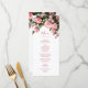 Detta meny kort för vilda blommor har rosa 3D-rosor och grönska och ett elegant handskrivet typsnitt på vit bakgrund. Anpassa det med brud och brudgum namn på baksidan.