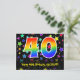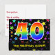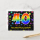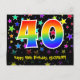 Framsidan av denna färgglada, roliga och spännande födelsedagsteman postkort design har ett stort nummer "40" med ett regnbågsspektrum gradient-inspirerat mönster. Den har också meddelandet "Happy 40th Birthday," och ett anpassat mottagarnamn. Framsidan har dessutom ett livfullt och färgglatt mönster av stjärnformer. Baksidan har ett anpassat födelsedagsgratuleringsmeddelande, eller kan kanske rensas och lämnas tomt om ett meddelande ska skrivas för hand istället. Ett anpassningsbart födelsedagskort som detta kan vara ett roligt sätt att skicka ett meddelande för att fira någon som fyller fyrtio. Postkort som detta kan också användas för att bjuda in gäster till en födelsedagsfest eller firande som hålls för någon som fyll