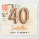 För en elegant och feminin 40-årsdag födelsedagsfest. En guldfärgad bakgrund. Dekorerad med en ro guld och en rosa vattenfärgad blomma, blommigt, grönt eucalyptus löv, spriter, grönsaks- och faux ro sprigs. Personalisera och namn. Svarta och gyllene brev. Namn är skrivet med ett modernt handskript i stil. Nummer 40 är skrivet med ett gyllene stil-teckensnitt.