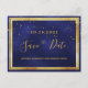 Spara datumkortet för en 40-årsdag party för en kille, man, man. En mörk blått bakgrund som är dekorerad med guldkonetti och faux guld och svart ram. Den blå färg är ojämn. Mallar för ett datum och namn/ålder 40. Golden färgad brev. Texten: Spara datumet skrivs med ett stort trendig-handskript i stil. Bakåt: utformning av vanligt vykort.