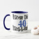 40-årspresent. Fyrtio år gammal. Hur hände 40? är det grafiska budskapet på denna blå och vita mugg.