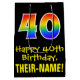 Denna spännande, färgstarka och roligt-födelsematade presentsäck har ett stort nummer "40" med en regnbågsspektrumövertoning som inspirerade mönster, tillsammans med budskapet "Lycklig 40:e födelsedag" och en anpassningsbar mottagare namn. Den har också en bakgrund med svart färgad. En roligt presentsäck av det här slaget kan användas när man slår in presenter som ges till någon i firande på deras 40-årsdag. [~Z0000512]