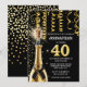 Ett modernt faux guld på svart design med ett faux guld flaska i mousserande vin med ett exploderande kork, mousserande guld glitter och lodrät hängströmmar bredvid vita textmallar som har ett stort antal fyrtio i guld på sig. De här är idealiska för hela 40-årsdagen och affärsdagen firande. Anpassa ordalydelsen till kostym för ditt evenemang.