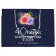 En stor presentväska för fester. Designad med en söt bouquet av ro och andra färgstarka spriter, löv och grenar. Ställ in på en marin blå bakgrund. Texten säger: 40 och fantastiskt, tack för att du kom, tillsammans med din personlig-händelseinformation.
