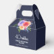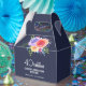 En födelsedagspressbox med en söt bukett av vattenfärgen ro och andra färgstarka sprit, löv och grenar. Ställ in på en marin blå bakgrund. Texten säger: 40 och fantastiskt, tack för att du kom, tillsammans med din personlig-händelseinformation.