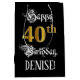 This elegant and elaborate birthday-themed gift bag design features the message “Happy 40th Birthday,”, plus a personalized recipient name. Some of the message is in a luxurious script-style text, the large number “40th” features a faux/imitation gold-inspired look pattern, and the background is colored black. An ornate birthday themed gift bag like this might be a respectable way to wrap a gift or present being given to celebrate somebody’s 40th birthday. [~Z0000560]