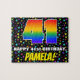 Denna djärva och glatta födelsedagskalematerade pussel har ett stort nummer "41" med ett multifärgat regnbågsspektrum som inspirerar gradienten mönster, tillsammans med meddelandet "LYCKLIG 41:a BIRTHDAY" och en anpassningsbar mottagare namn. Bakgrunden har en roligt, flerfärgad stjärna fält mönster. Ett öga-infångande, personligens födelsedagspressel som detta kan vara ett roligt sätt att leverera önskemål till någon som firar sin fyrtioförsta födelsedag. [~Z0000607]
