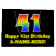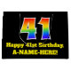 Den här färgstarka och livfulla presentsäcksdesignen på födelsedagen har ett stort nummer "41" med en regnbågsspektrumövertoning som inspirerat mönster. Det innehåller också budskapet "Lycklig 41:a födelsedag" och ett anpassade namn. Den har också en bakgrund med svart färgad. En presentsäck som denna kan vara ett roligt sätt att fylla på en födelsedagspresent eller gåva som ges till någon som firar sin fyrtioårsdag. [~Z0000521]