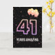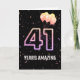 Party-ballonger och konfetti på svart bakgrund med neon nummer 41 på 41:a födelsedag.