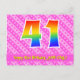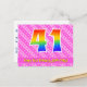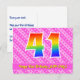 Framsidan av denna roliga, livliga och kärleksfulla födelsedagskortdesign har en stor siffra "41" med ett regnbågsspektrum-gradering-mönster, tillsammans med meddelandet "Grattis på 41-årsdagen," och en personlig mottagares namn. Framsidan har dessutom ett lyckligt ljust rosa och mörkt rosa-randigt mönster med hjärtformer. Baksidan har ett redigerbart födelsedagsgratulationsmeddelande, eller skulle kunna rensas och lämnas tom om ett meddelande ska skrivas för hand istället. Ett anpassningsbart födelsedagskort som detta kan vara ett roligt sätt att fira någon på deras fyrtioförsta födelsedag. Postkort som detta kan också användas för att inbjuda gäster till en födelsedagsfest eller kalas som hålls för någon som