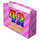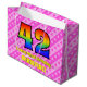 Den här lycklig och den 42:a födelsedagelaterade presentsäcksdesignen har ett stort nummer "42" med ett regnbågsspektrum som inspirerar gradienten mönster. Det innehåller också budskapet "Lycklig 42:a födelsedagen" och ett redigerbart namn. Bakgrunden har en ljus rosa och mörk rosa rand mönster som innehåller levande hjärtformer av rosa. Sådana presentsäckar kan användas när man slår in presenter eller ger gåvor till någon som firar sin fyrtioandra födelsedag. [~Z0000414]