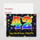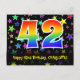 Framsidan av denna färgglada, roliga och spännande födelsedagsteman postkortsdesign har en stor siffra "42" med ett regnbågsspektrum-gradering inspirerat mönster, tillsammans med meddelandet "Grattis på 42-årsdagen," och ett redigerbart mottagarnamn. Framsidan har dessutom ett livfullt och färgglatt bakgrundsmönster med stjärnformer i olika storlekar. Baksidan har ett anpassat födelsedagsgratulationsmeddelande, eller kanske kan rensas och lämnas tomt om ett meddelande ska skrivas för hand istället. Ett födelsedagskort som detta kan vara ett roligt sätt att skicka födelsedagsönskningar till någon som firar sin fyrtiotvåårsdag. Postkort som detta kan också användas för att inbjuda gäster till