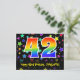 Framsidan av denna färgglada, roliga och spännande födelsedagsteman postkortsdesign har en stor siffra "42" med ett regnbågsspektrum-gradering inspirerat mönster, tillsammans med meddelandet "Grattis på 42-årsdagen", och ett redigerbart mottagarnamn. Framsidan har dessutom ett livfullt och färgglatt bakgrundsmönster med stjärnformer i olika storlekar. Baksidan har ett anpassat födelsedagsmeddelande, eller kan kanske rensas och lämnas tomt om ett meddelande ska skrivas för hand istället. Ett födelsedagskort som detta kan vara ett roligt sätt att skicka födelsedagsönskningar till någon som firar sin fyrtioandra födelsedag. Postkort som detta kan också användas för att bjuda in gäster till en